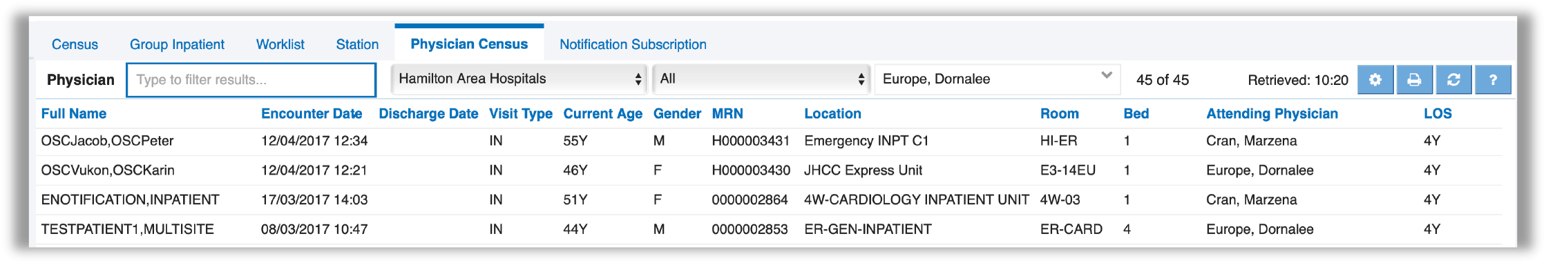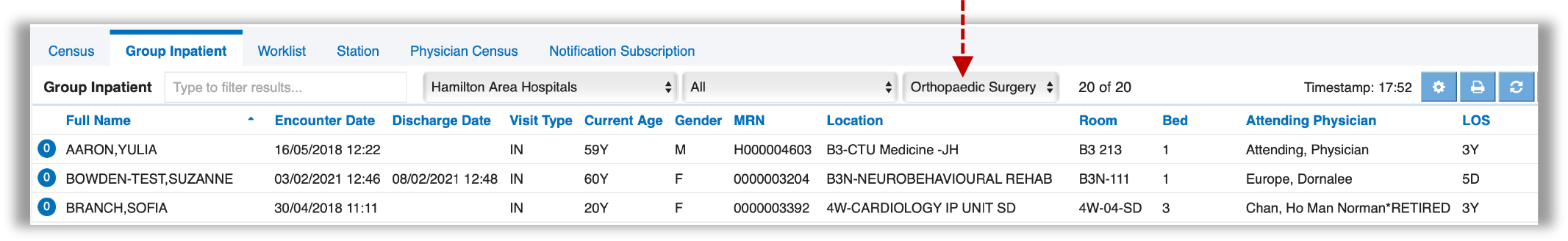Group Inpatient census is used for select physician groups and displays all inpatients associated with the group of physicians based on the physician’s CPSO number. These physician groups are defined within the source Health Information System (HIS) and are available for select source hospitals systems. This list is useful for physicians that are covering for a specific physician group within that source hospital system. If the user is not associated with Group Inpatients, this census list will not display. User’s accounts that are configured to support multiple physicians (such as physician’s administrative support) will have an additional Physician field and will be able to filter this list by selecting the physician’s name, to see only the patient’s associated with the selected physician. Physician groups are defined within the source HIS and may be available only for select source hospitals. This list is useful for physicians that are covering for a specific physician group within that source hospital system.